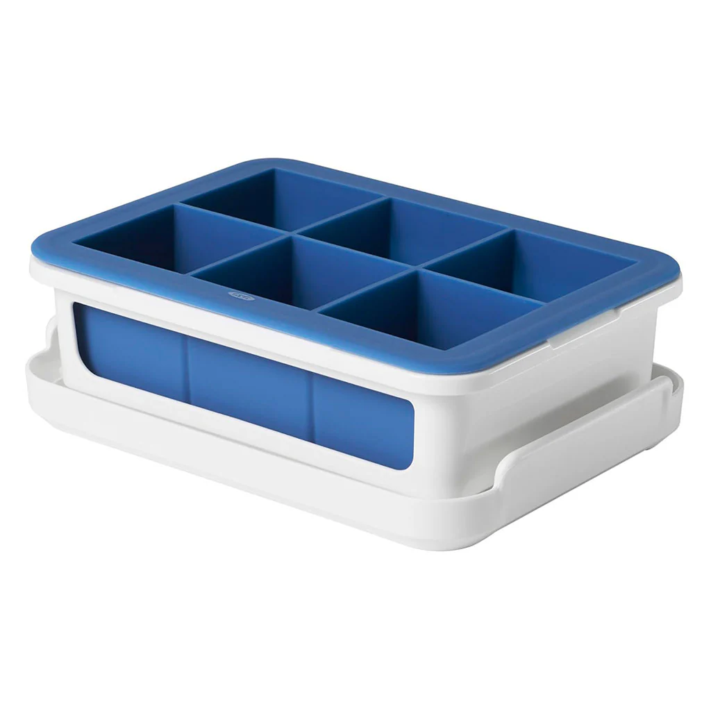 La Bandeja de hielo para cubitos grandes OXO es perfecta para preparar refrescos, whisky u otras bebidas de grandes dimensiones en vasos de rock.