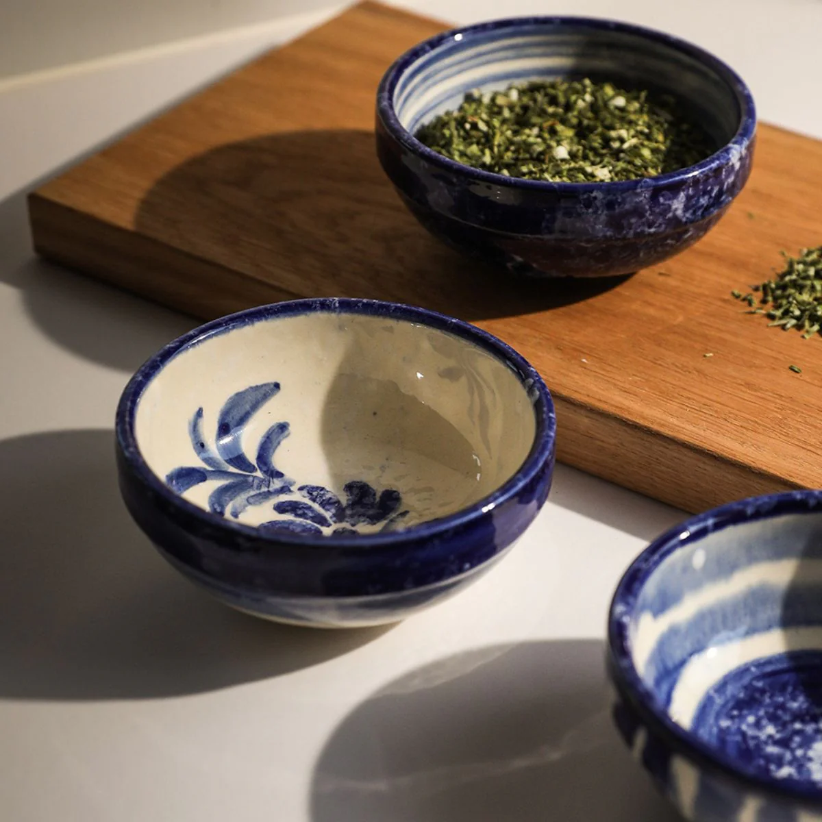 Pintados a manos con maestría y delicadeza, los boles combinan los colores blanco y azul con unos acabados encantadores, muy mediterráneos. Con estos pequeños cuencos te encantará presentar tus aperitivos o servir las salsas y untables para dipear. Unas almendras saladas, unas aceitunas aliñadas, un poco de hummus o de olivada, repartidos con gracia en tu mesa, se convertirán en objeto de todas las miradas.