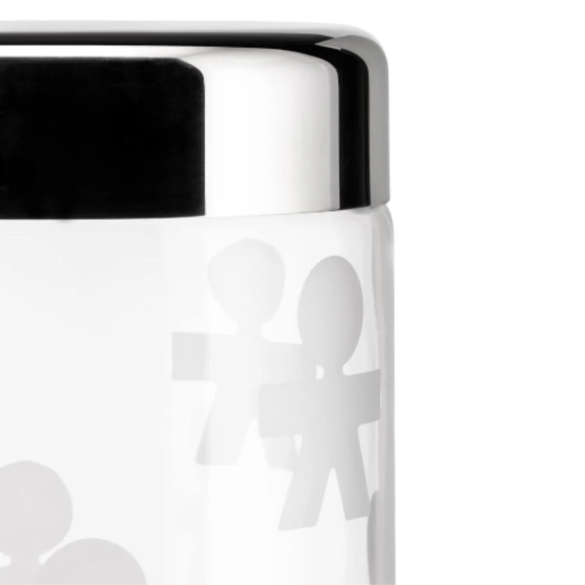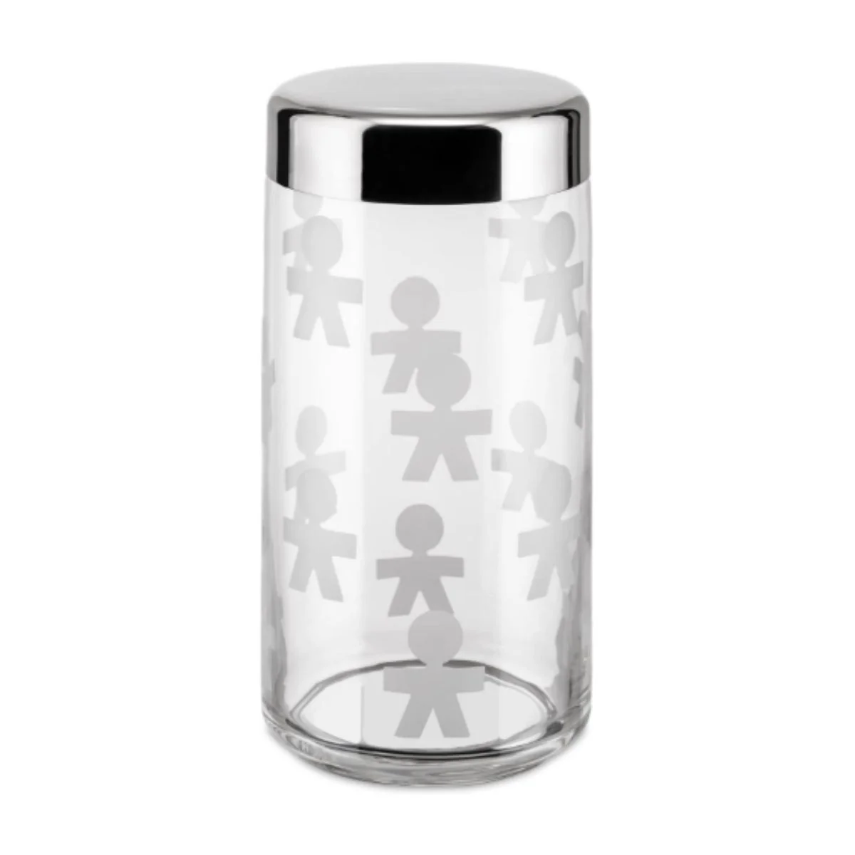 El cuerpo del bote es de vidrio, cosa que permite ver en todo momento la cantidad de alimento o ingrediente que hay en su interior. Esto representa una gran ventaja en comparación con los botes opacos que requieren ser abiertos. Por otro lado, la tapa es de acero y garantiza el cierre hermético. El cuerpo del bote está decorado con los «hombre de pie» unos dibujitos que ya han aparecido en algunos diseños de Alessi.