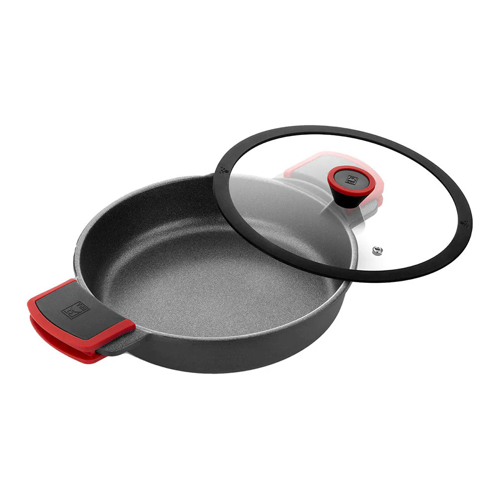 La cacerola baja Bistro de BRA incluye la tapa y las asas de silicona, ambas con un toque de color rojo, uno de los rasgos distintivos de esta colección. La tapa es de cristal y permite visualizar el estado de la cocción cómodamente en cualquier momento. Además, el borde de ésta es de silicona y sella a la perfección. Tanto las asas como el pomo de la tapa son ergonómicos y termorresistentes para garantizar un sujeción óptima y un fácil manejo.