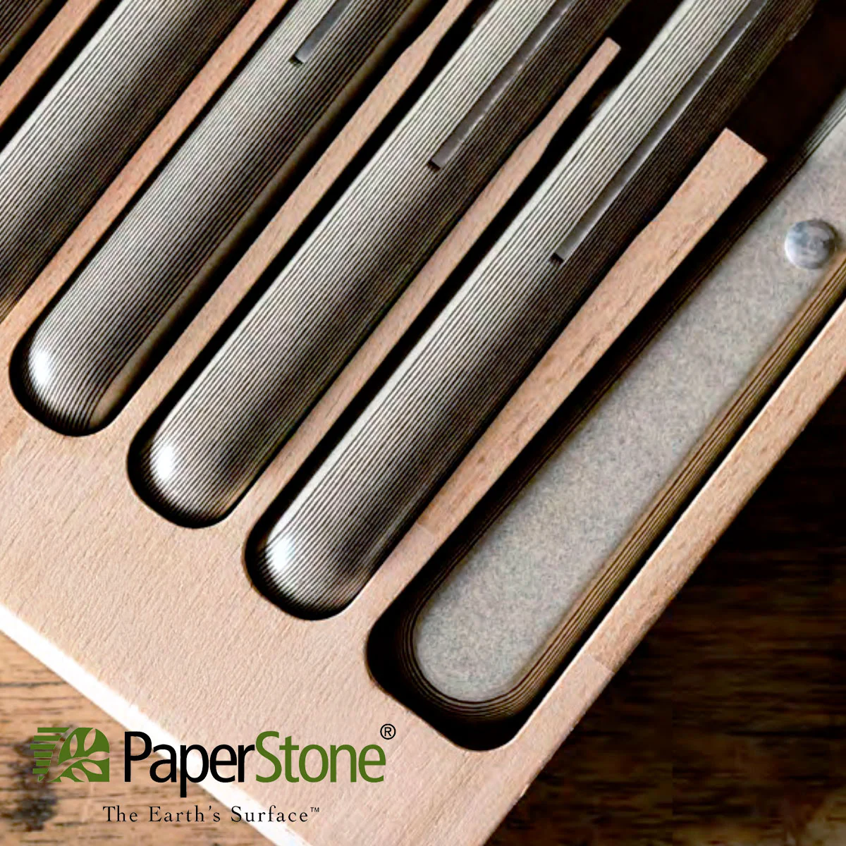 Los mangos de los cuchillos Claudia&Julia están fabricados en PaperStone®, un material de nueva generación cuyo corazón es 100 % papel reciclado certificado FSC®, impregnado con una resina propia llamada PetroFree™, derivada de subproductos industriales en lugar de petróleo virgen.