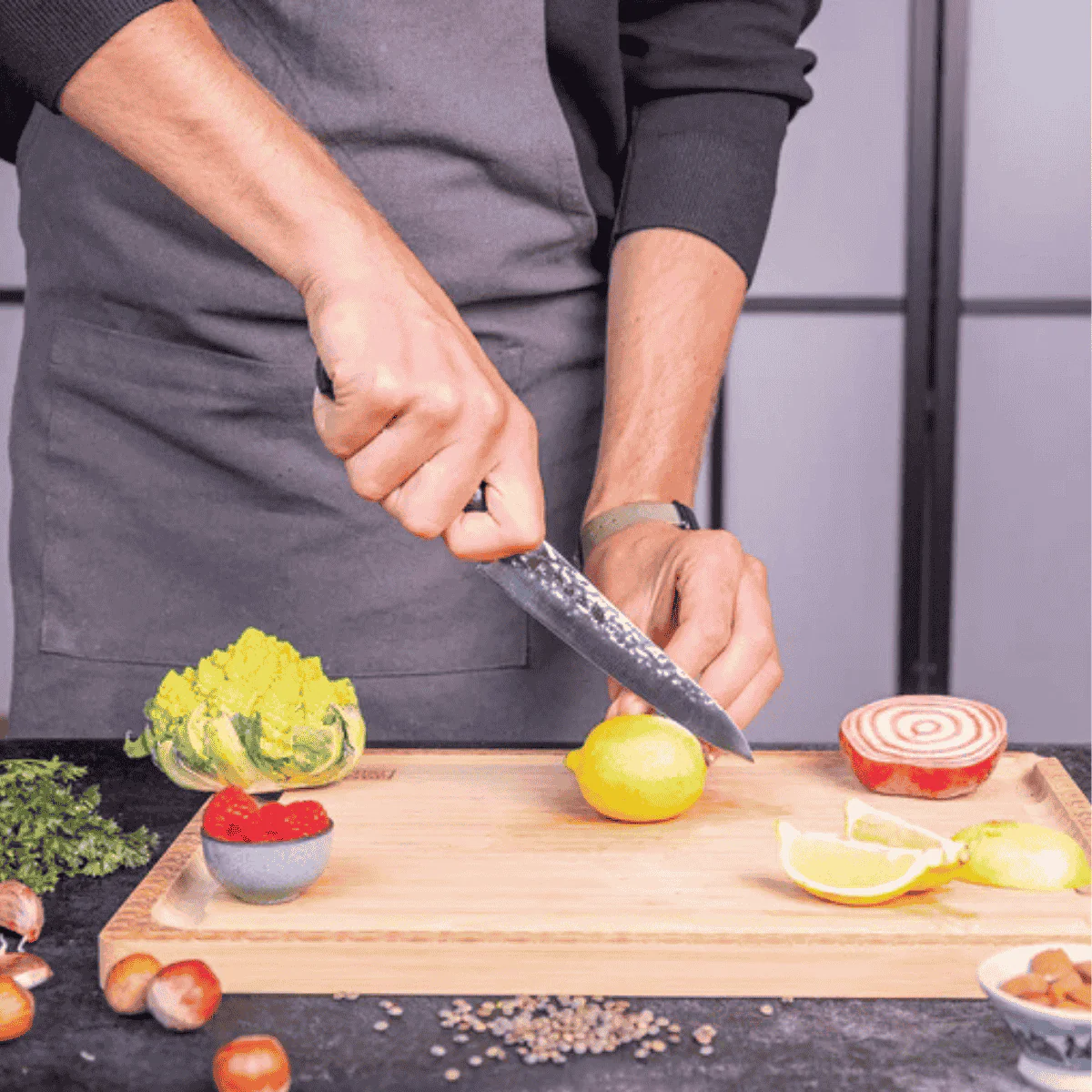 La distribución perfecta del peso y su elegante mango han sido diseñados para que puedas cortar sin esfuerzo todo tipo de alimentos, incluso los más duros. Los mangos con triple remache son de madera de pakka negra, que es ideal para su uso en cocina, ya que destaca por sus propiedades antibacterianas, su resistencia al agua y su durabilidad.