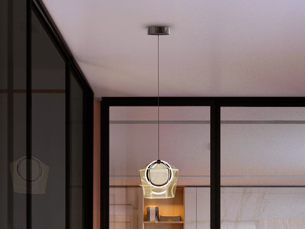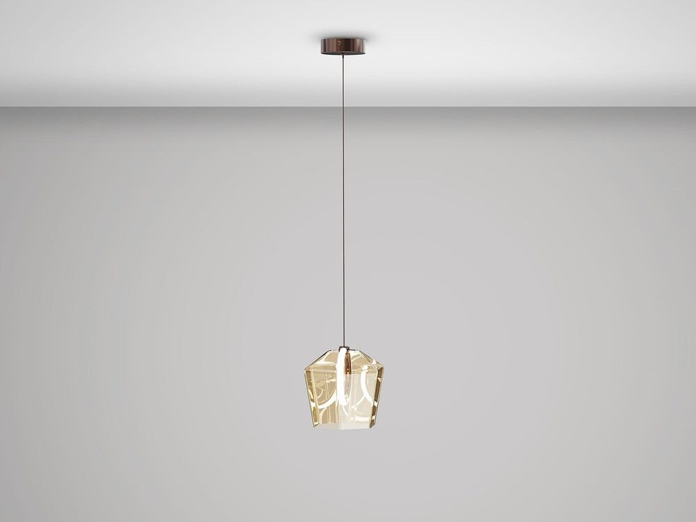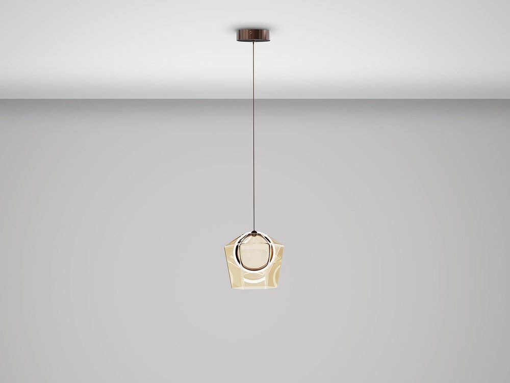 Lámpara de 1 luz, realizada en aluminio cepillado acabado en tono bronce oscuro. Tulipa de cristal tintado en tono champán con aro interior de luz LED y difusor de silicona. 6W LED, 161 lm, 3000K