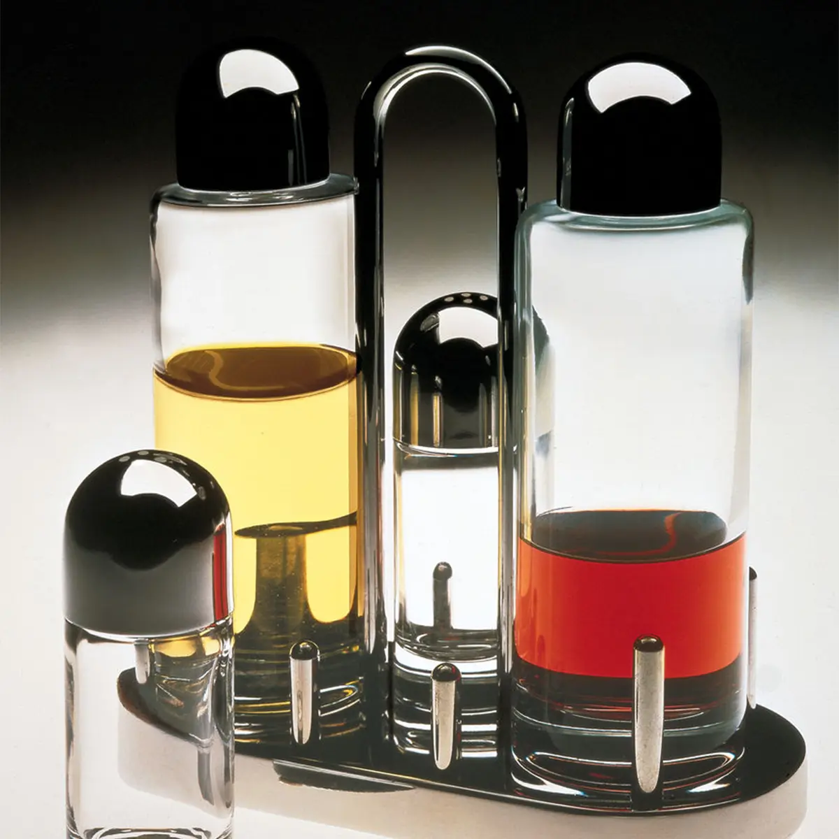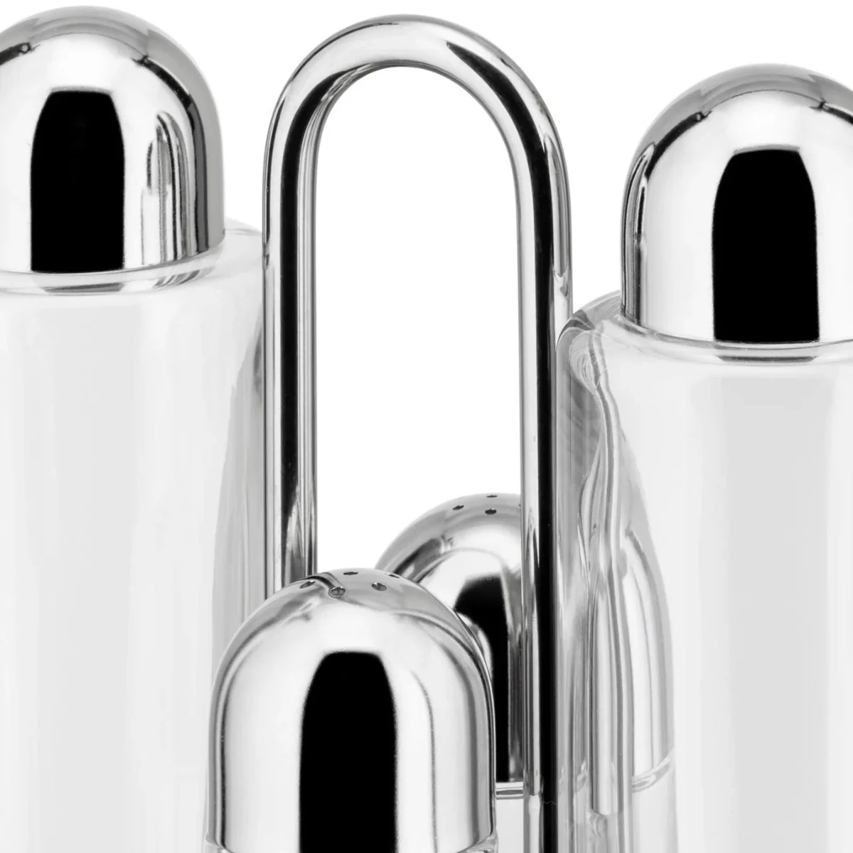 Con este juego de condimientos de 4 piezas de acero inoxidable Alessi podrás tener el aceite, el vinagre, la sal y la pimienta ordenados en un mismo lugar y traerlos a la mesa cómodamente para que todo el mundo se aliñe la comida a su gusto. Es mucho más práctico tenerlo en un mismo juego que tener que traer cuatro piezas por separado.