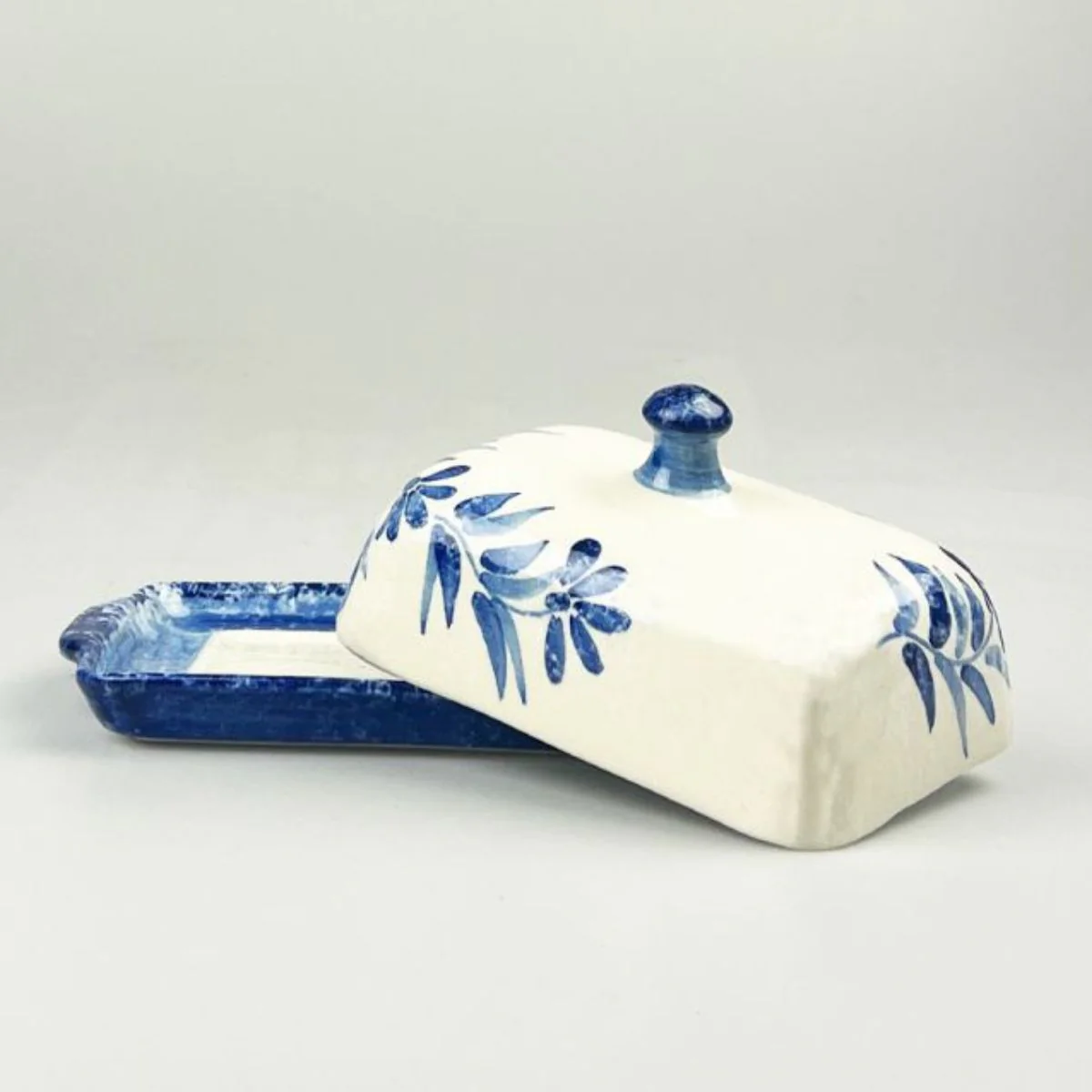 La mantequillera de cerámica combina con maestría el diseño tradicional de bandeja con tapa, con un estampado de olivas delicadamente pintado a mano. Los colores blanco y azul transmiten calma en una mantequera que lucirá en la mesa del desayuno o la de cualquier ocasión. Al estar hecha y pintada a mano, cada mantequillera es única.