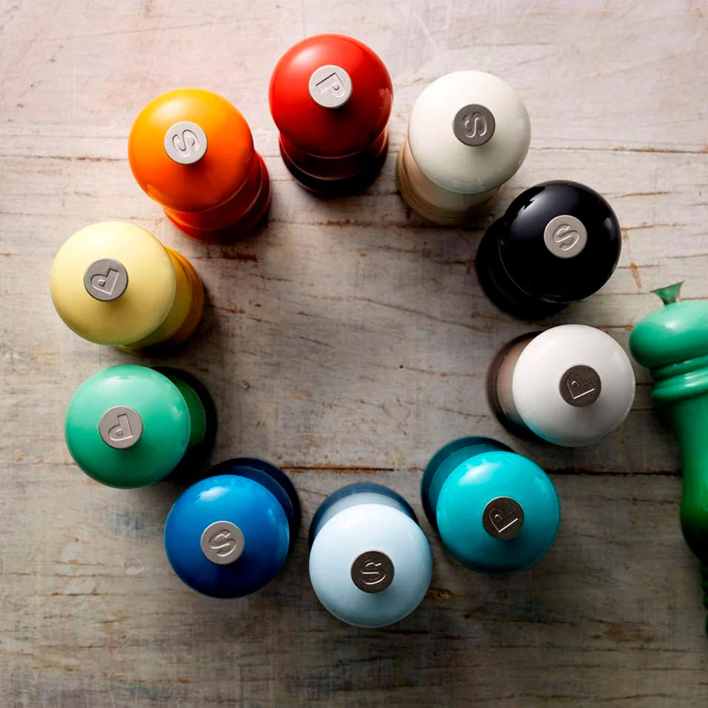 De alegres colores, puedes elegir los molinillos para sal y pimienta en el mismo tono, ya que podrás identificar su contenido gracias a los marcadores de uso con la S o la P, o bien combinarlos como más te guste para saber con solo un vistazo cuál vas a utilizar.