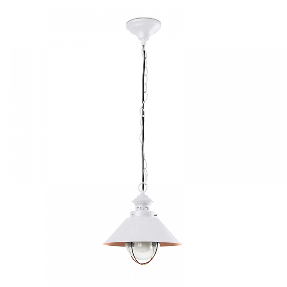 Colgante atemporal fabricado en metal y difusor de cristal burbuja pensado para la iluminación de terrazas y jardines. Su combinación de colores, blanco y cobre, le da un aspecto de clásico renovado.