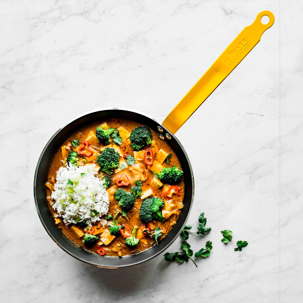El mango de la sartén antiadherente Choc Resto Induction es de hierro y puede calentarse al cocinar. Para poder manejar la sartén con seguridad y comodidad puedes usar la Funda protectora para el mango de sartenes De Buyer.