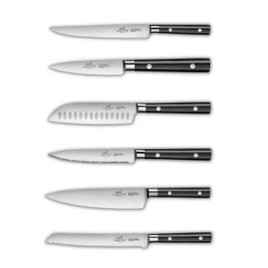 - Cuchillo Santoku. Con hoja alveolada de 12 cm, es un cuchillo perfecto para cortar, rebanar y picar todo tipo de alimentos con gran efectividad, ya sea carnes, vegetales o pescados.