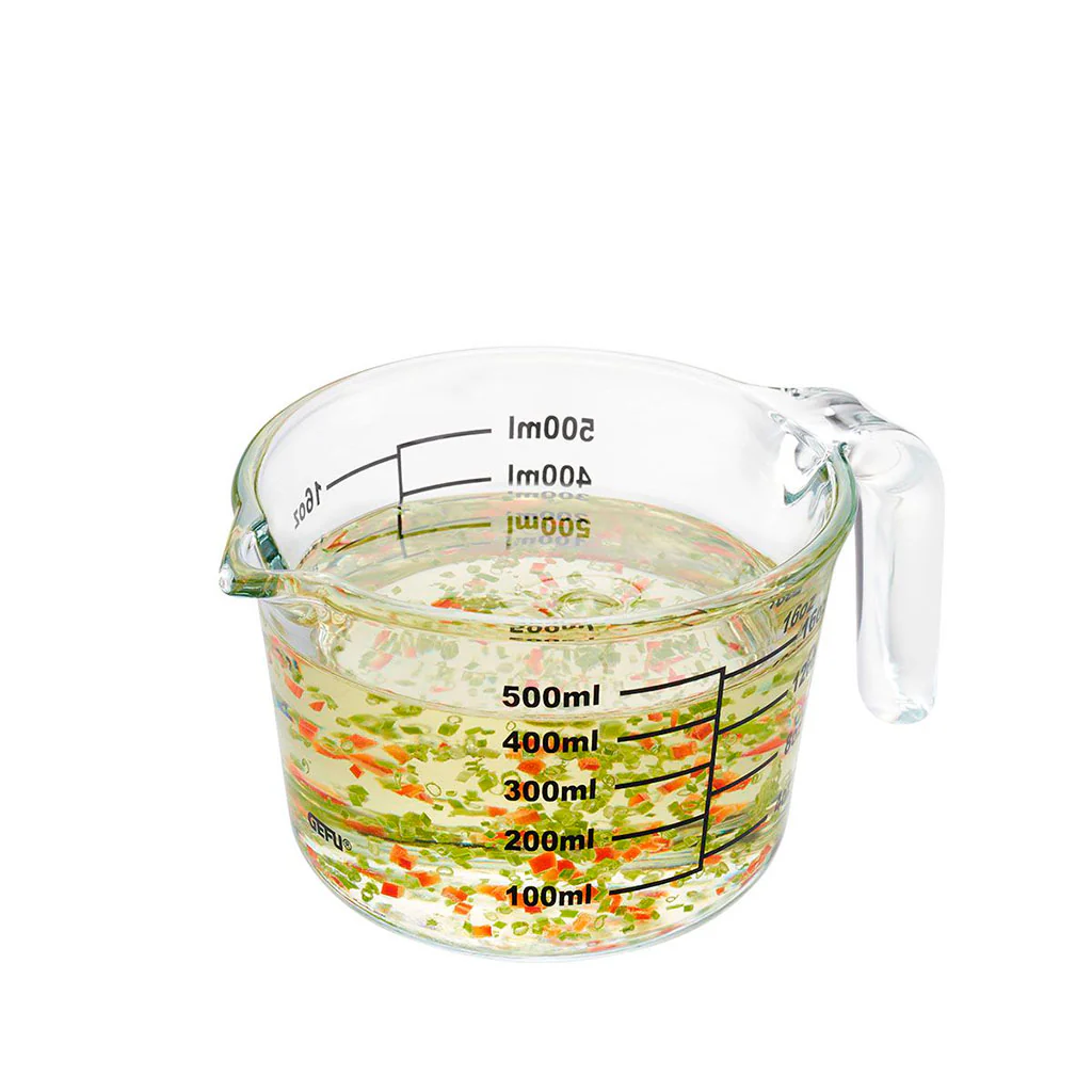 El Vaso medidor Dimenso Gefu se convertirá en tu mejor ayudante para medir líquidos con precisión y facilidad. Fabricado en vidrio de borosilicato transparente y resistente a temperaturas de hasta 450 °C, el vaso dispone de una escala medidora con mililitros y onzas para que puedas medir todo tipo de líquidos con facilidad, tanto calientes como fríos.